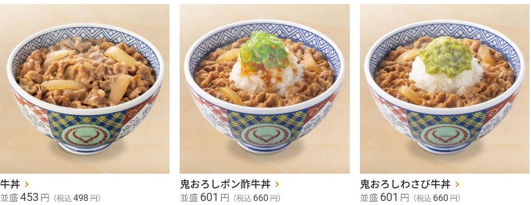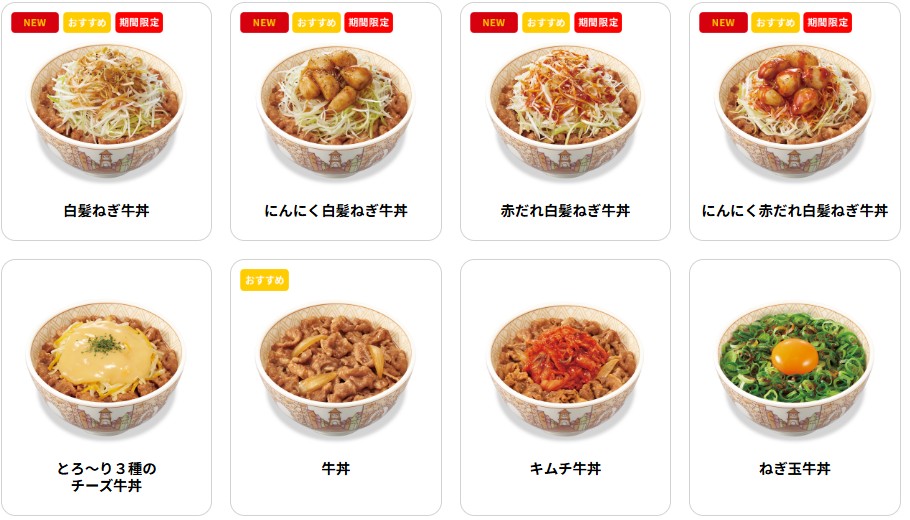 人気メニュー:牛丼並盛、ねぎ玉牛丼